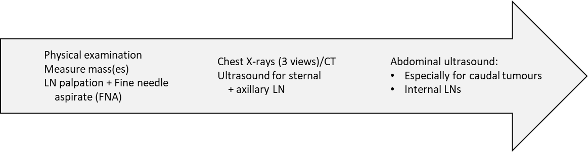 - Lack of staging can lead to unrealistic owner expectations, inappropriately planned surgery and worse prognosis. Thorough staging prior to surgery is needed to detect disease beyond the mammary glands and regional LNs.