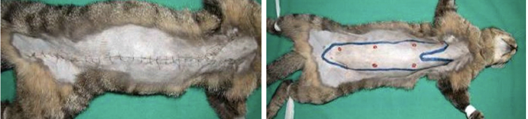 The type of surgery carried out is an independent prognostic factor for median times to recurrence and survival: a radical bilateral mastectomy with removal of affected/suspected lymph nodes gives the best prognosis (Figure 2). The radical bilateral surgery technique involves an en bloc resection with lateral margins of 2 – 3 cm and removal of fascia at least in area of potential recurrence (i.e. below the mass). The current recommendation is to do one procedure rather than two unilateral procedures 4 weeks apart.